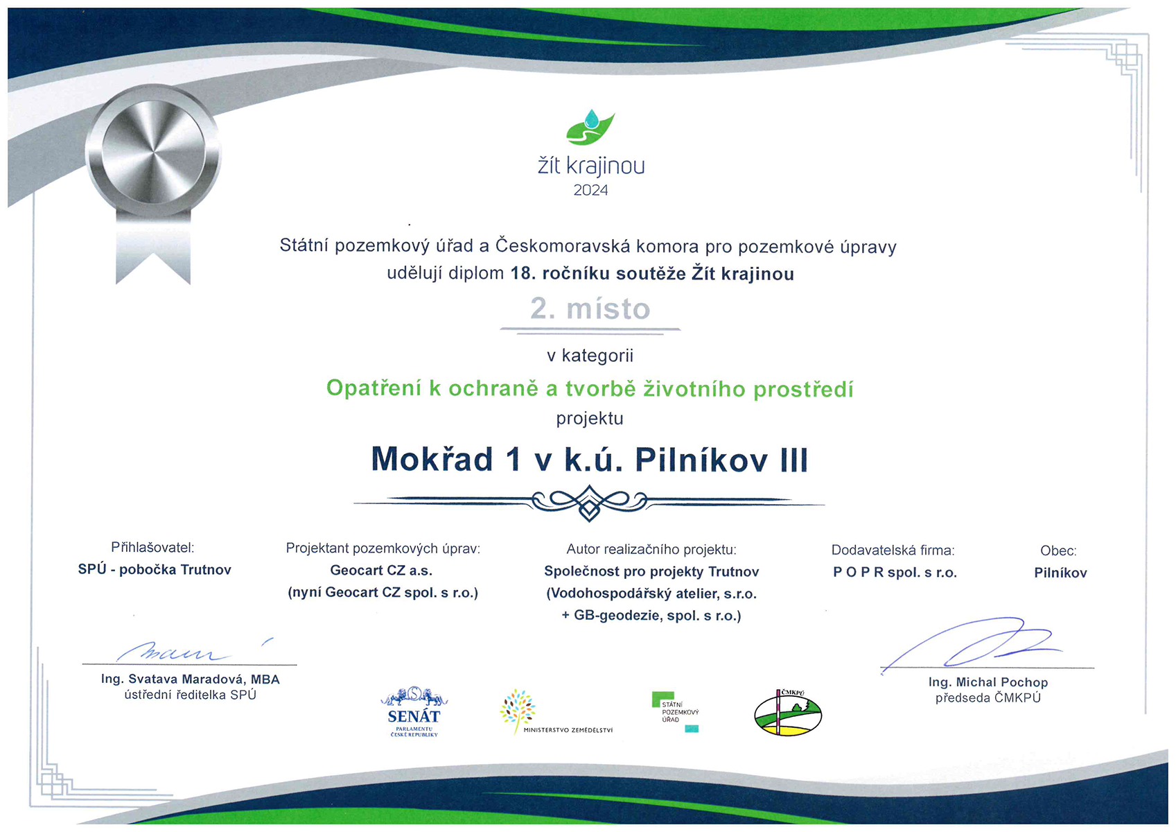 Společnost Geocart CZ spol. s r.o. získala významné ocenění v letošním ročníku soutěže Žít krajinou 2024. V kategorii Opatření k ochraně a tvorbě životního prostředí obsadila 2. místo za projekt Mokřad 1 v k. ú. Pilníkov III. Ocenění je potvrzením, že dlouhodobá a odborně vedená práce v krajině má smysl a přináší viditelné výsledky.